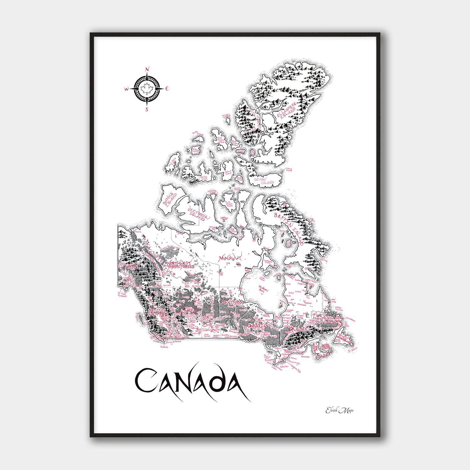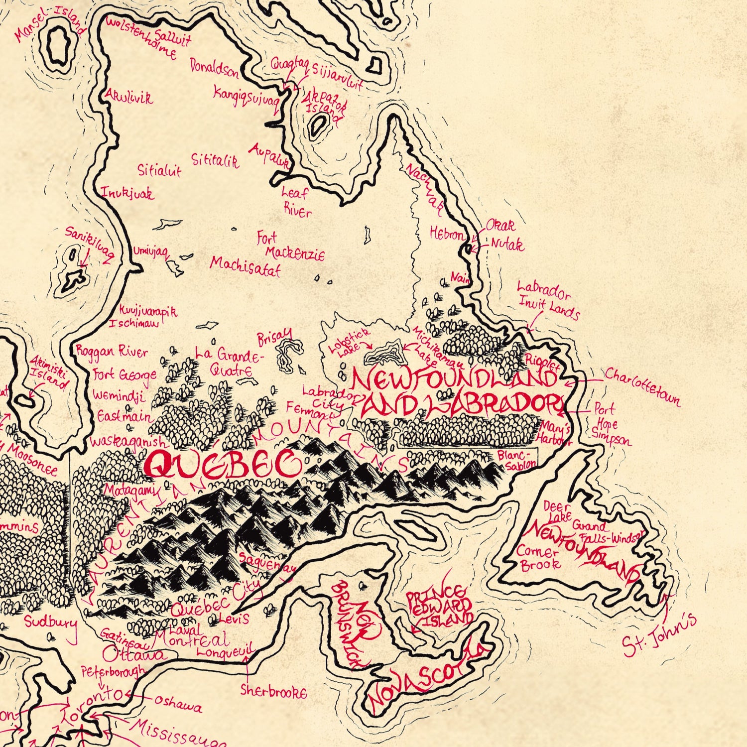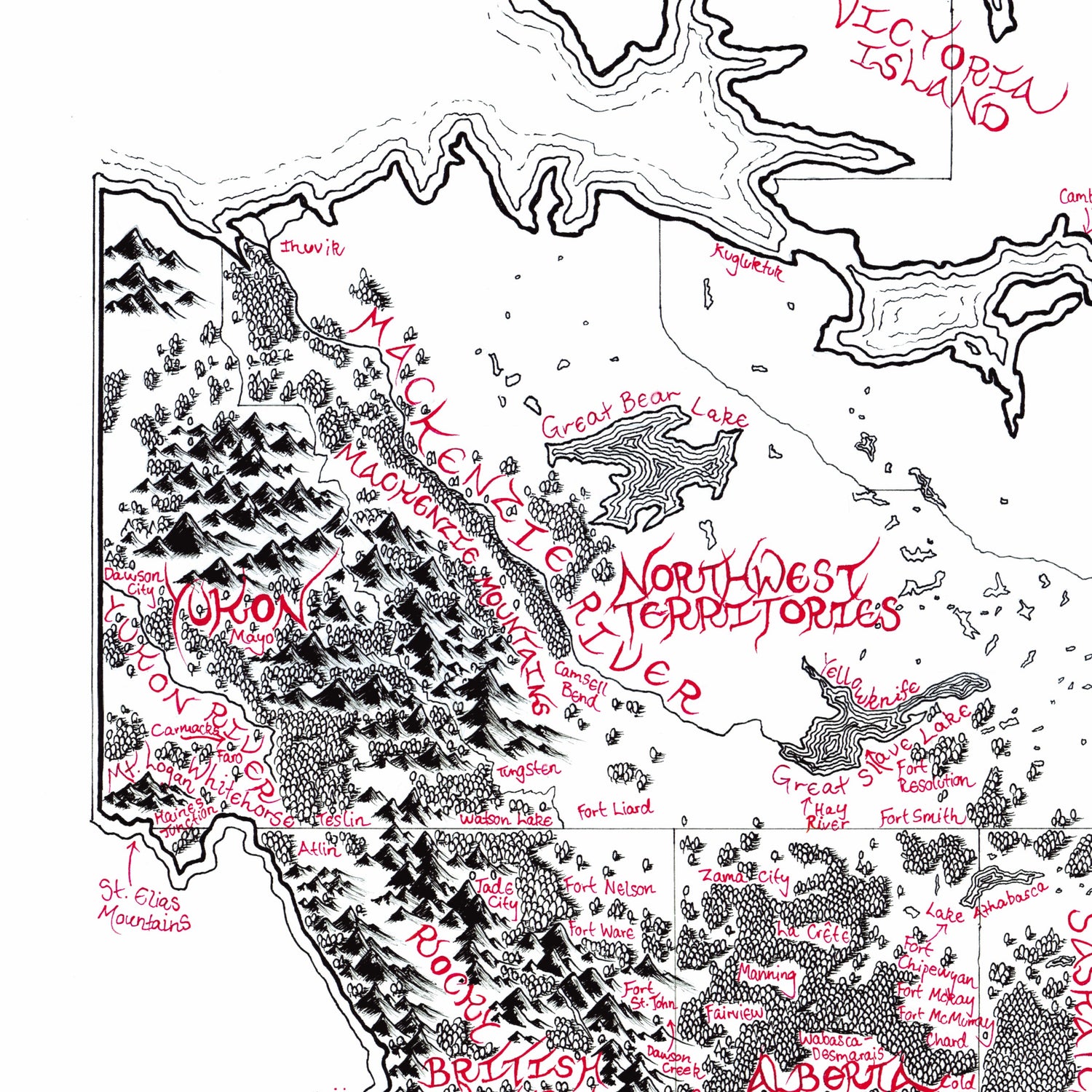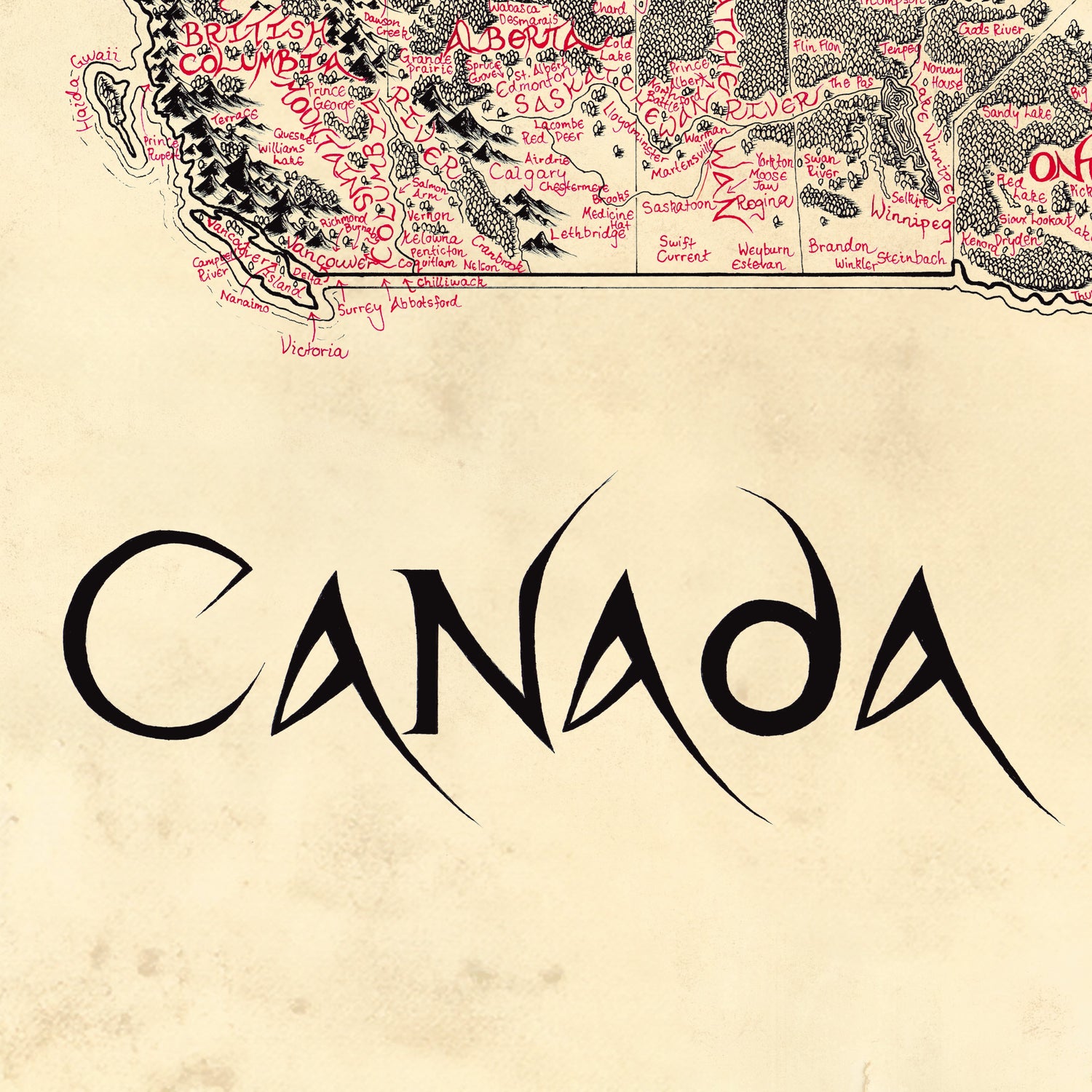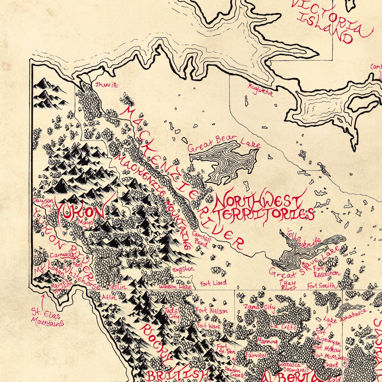 Everything on this map of Canada is done in the style of Tolkien. The inspiration I took from his technique when making this map flows through every river, is engraved into every little valley and mountain, and lines every coast and island. Even the place names and mountain names are done in a Tolkien style font to make the map of Canada feel like it comes from somewhere deep in middle earth.