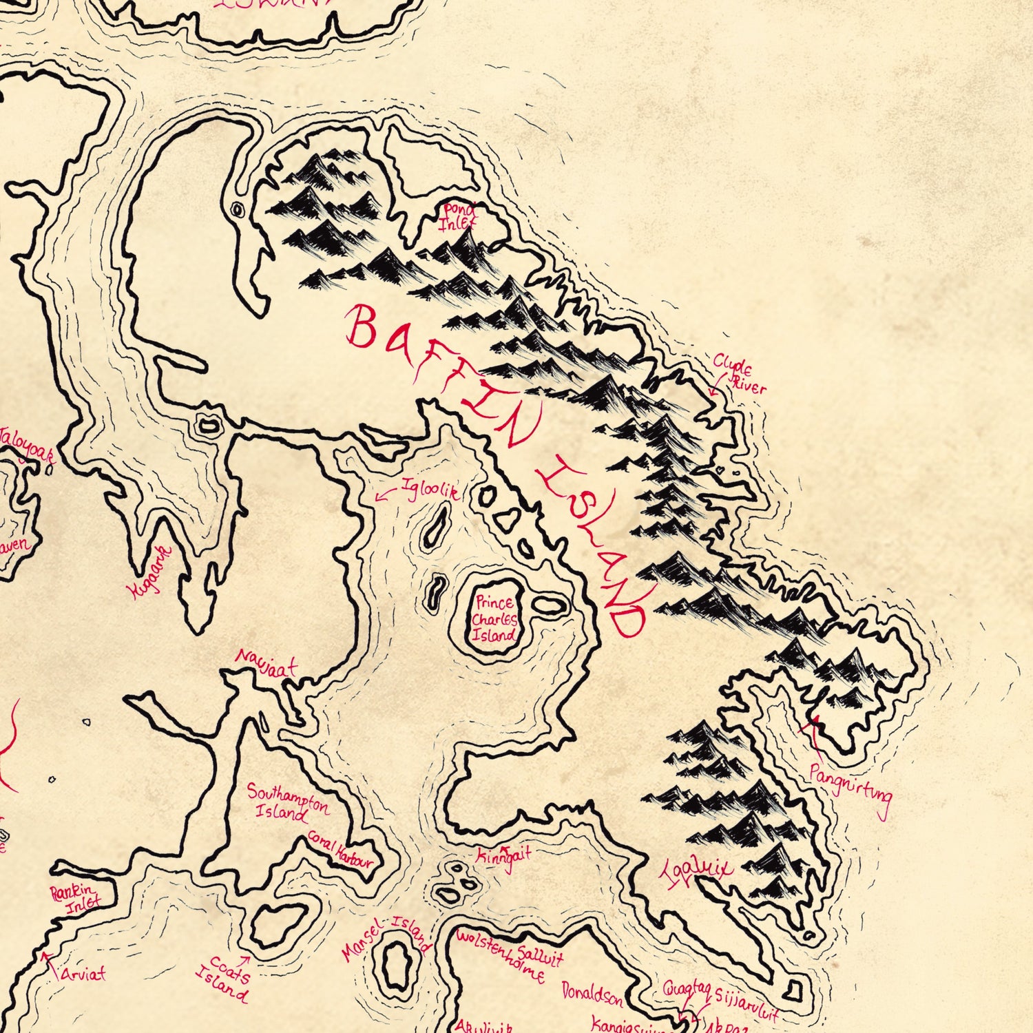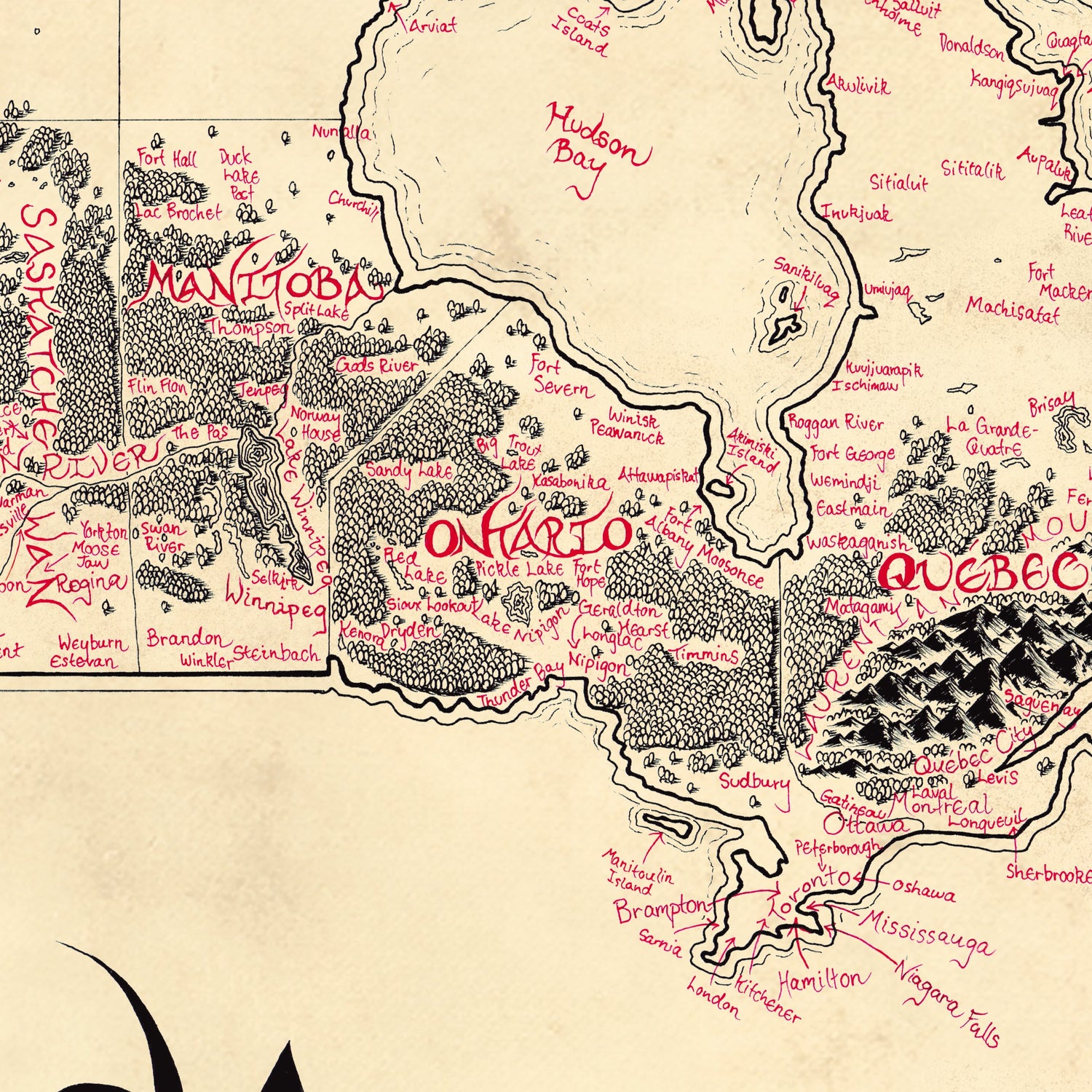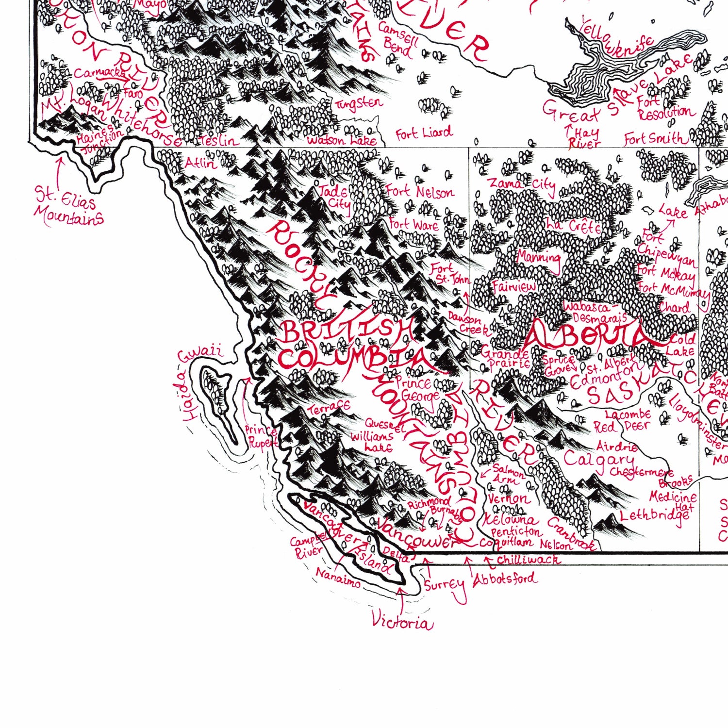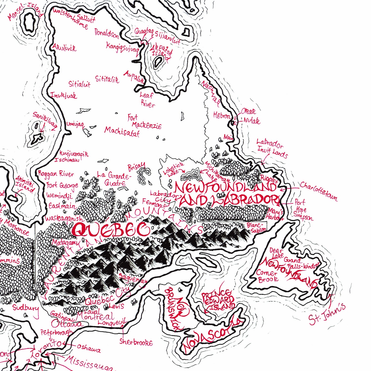 Everything on this map of Canada is done in the style of Tolkien. The inspiration I took from his technique when making this map flows through every river, is engraved into every little valley and mountain, and lines every coast and island. Even the place names and mountain names are done in a Tolkien style font to make the map of Canada feel like it comes from somewhere deep in middle earth.