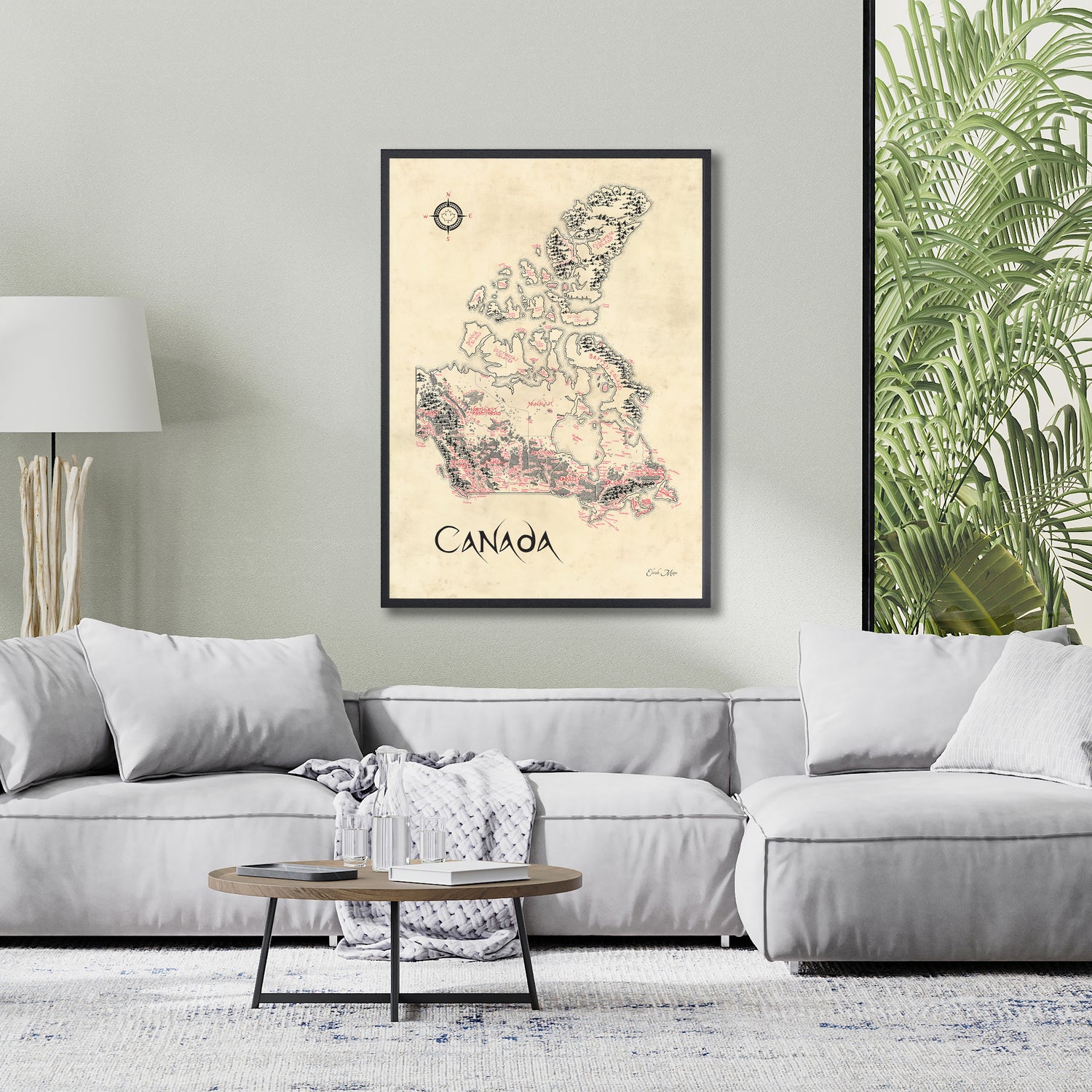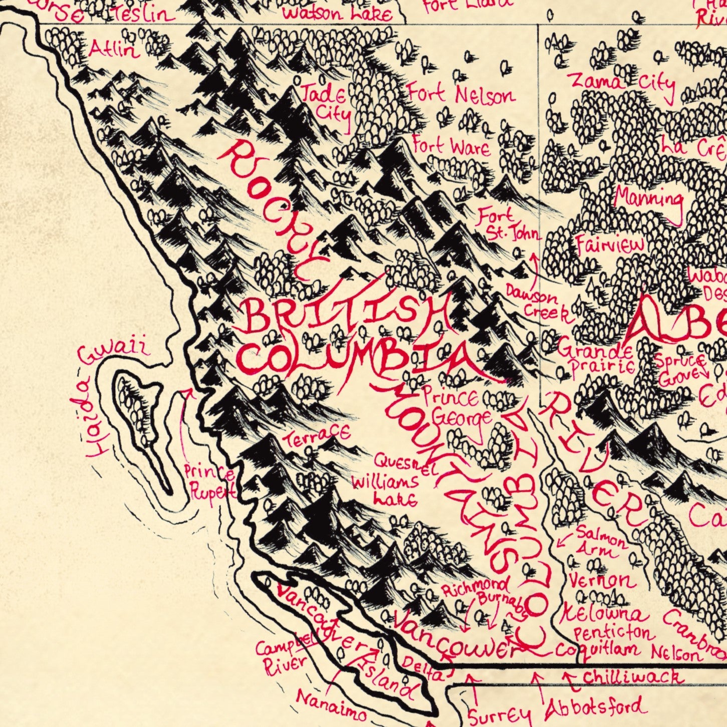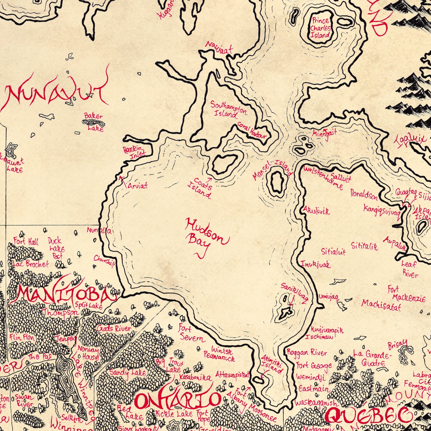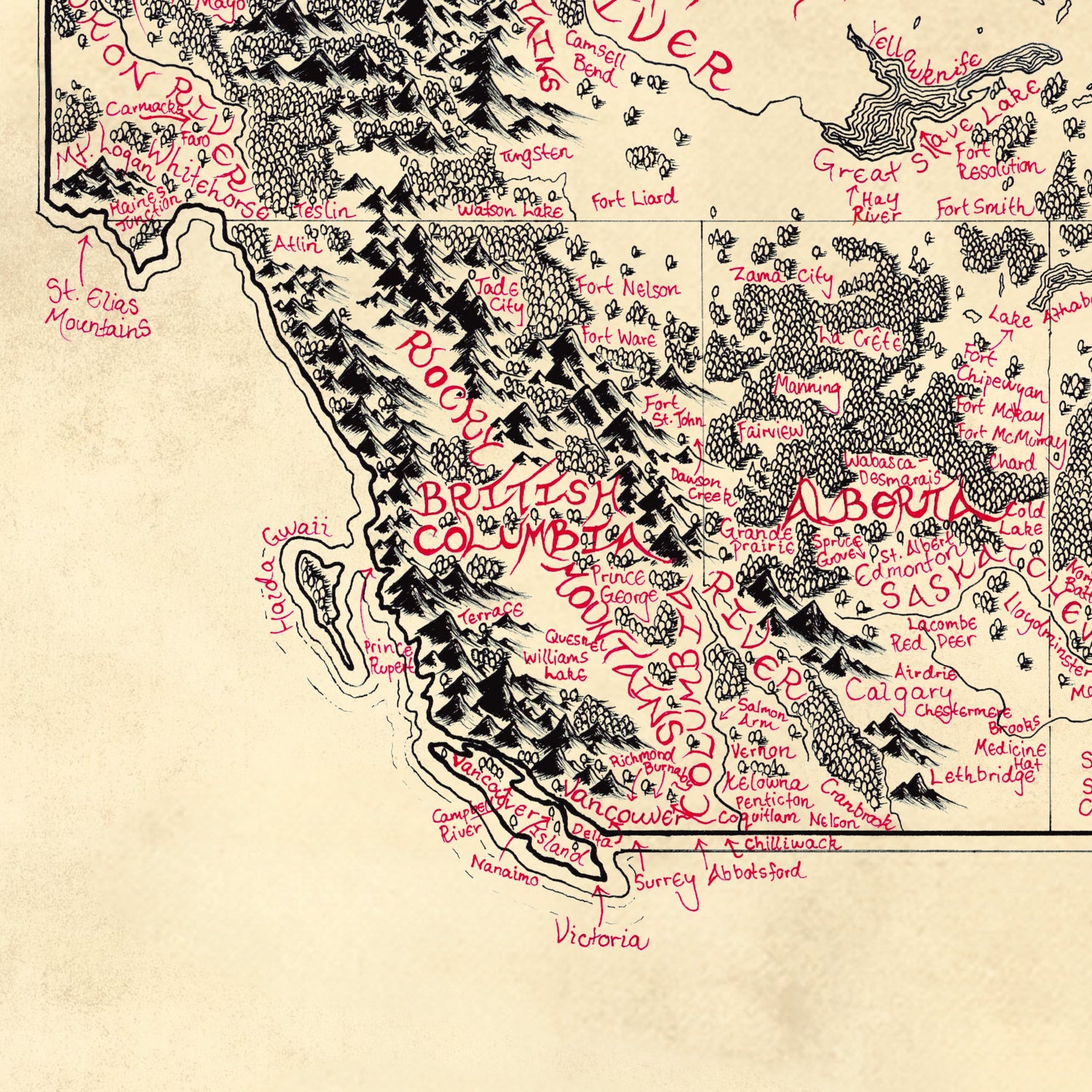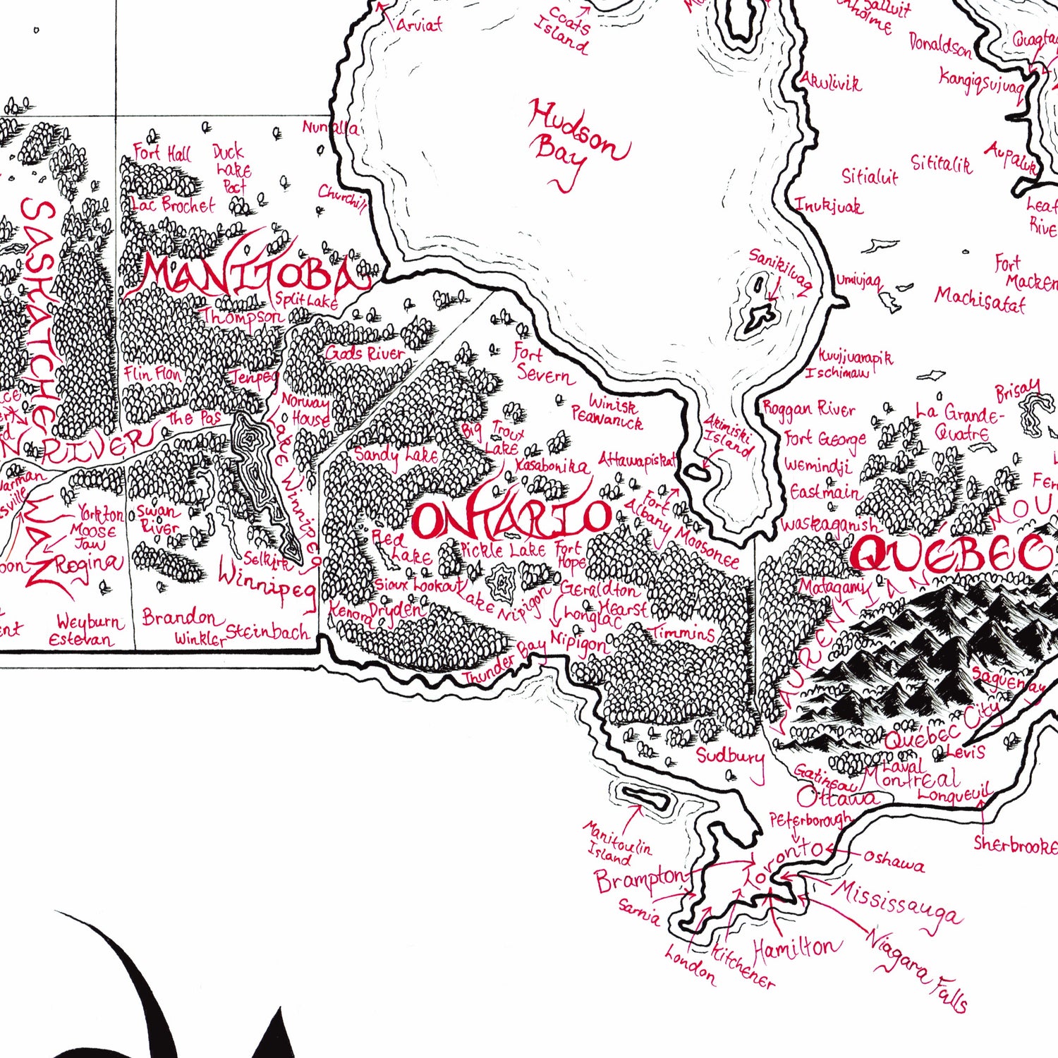 Everything on this map of Canada is done in the style of Tolkien. The inspiration I took from his technique when making this map flows through every river, is engraved into every little valley and mountain, and lines every coast and island. Even the place names and mountain names are done in a Tolkien style font to make the map of Canada feel like it comes from somewhere deep in middle earth.